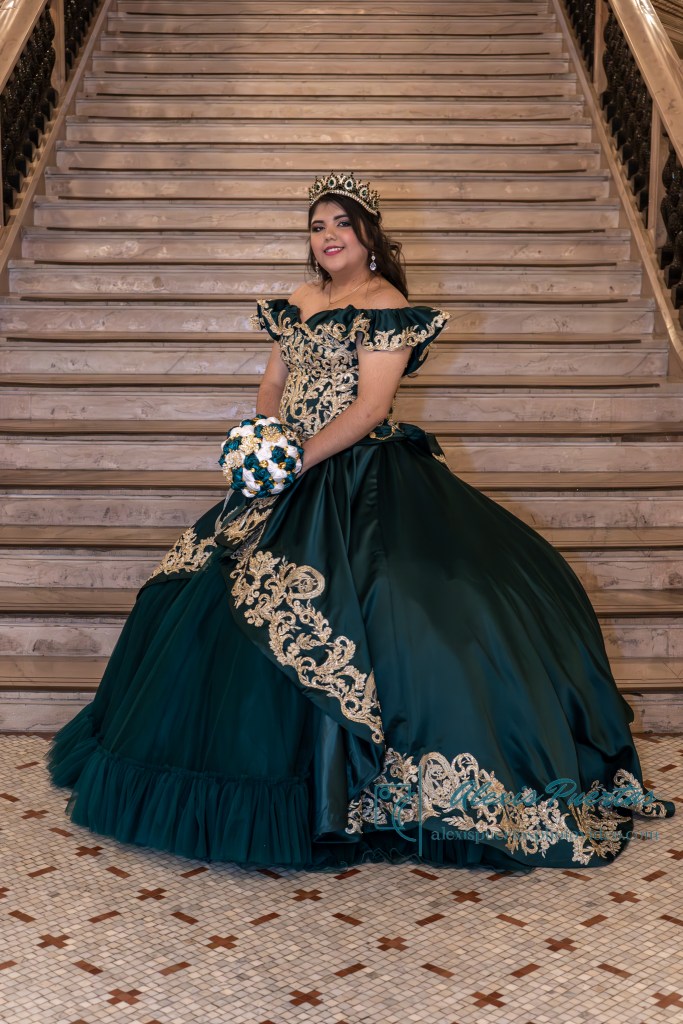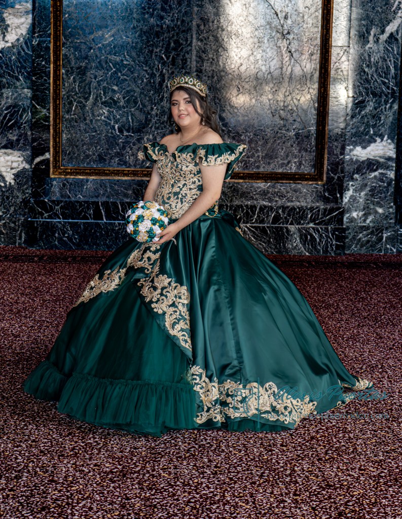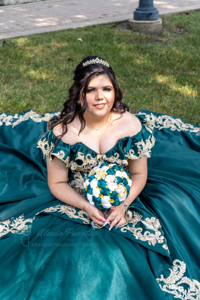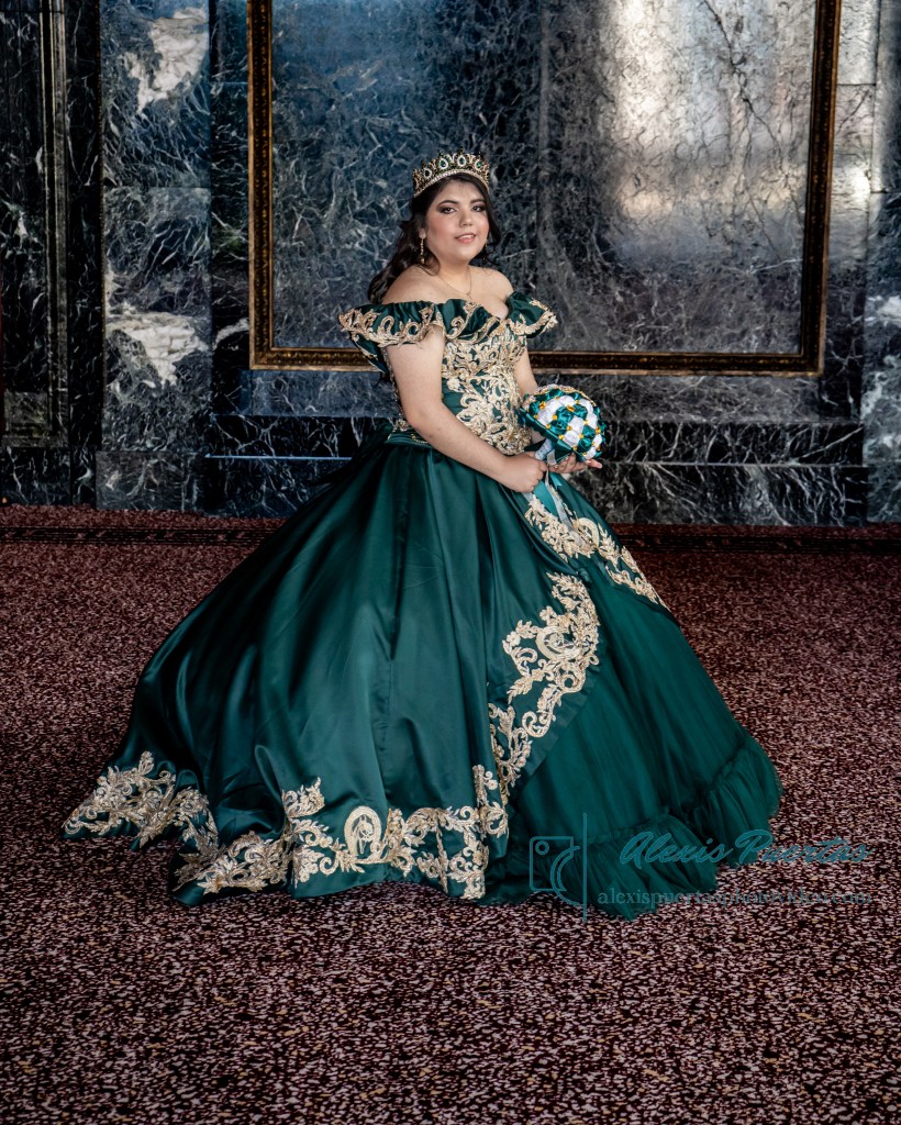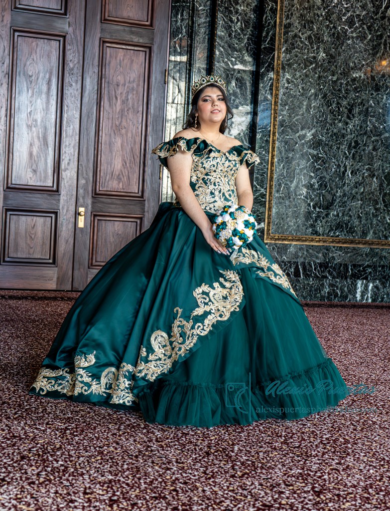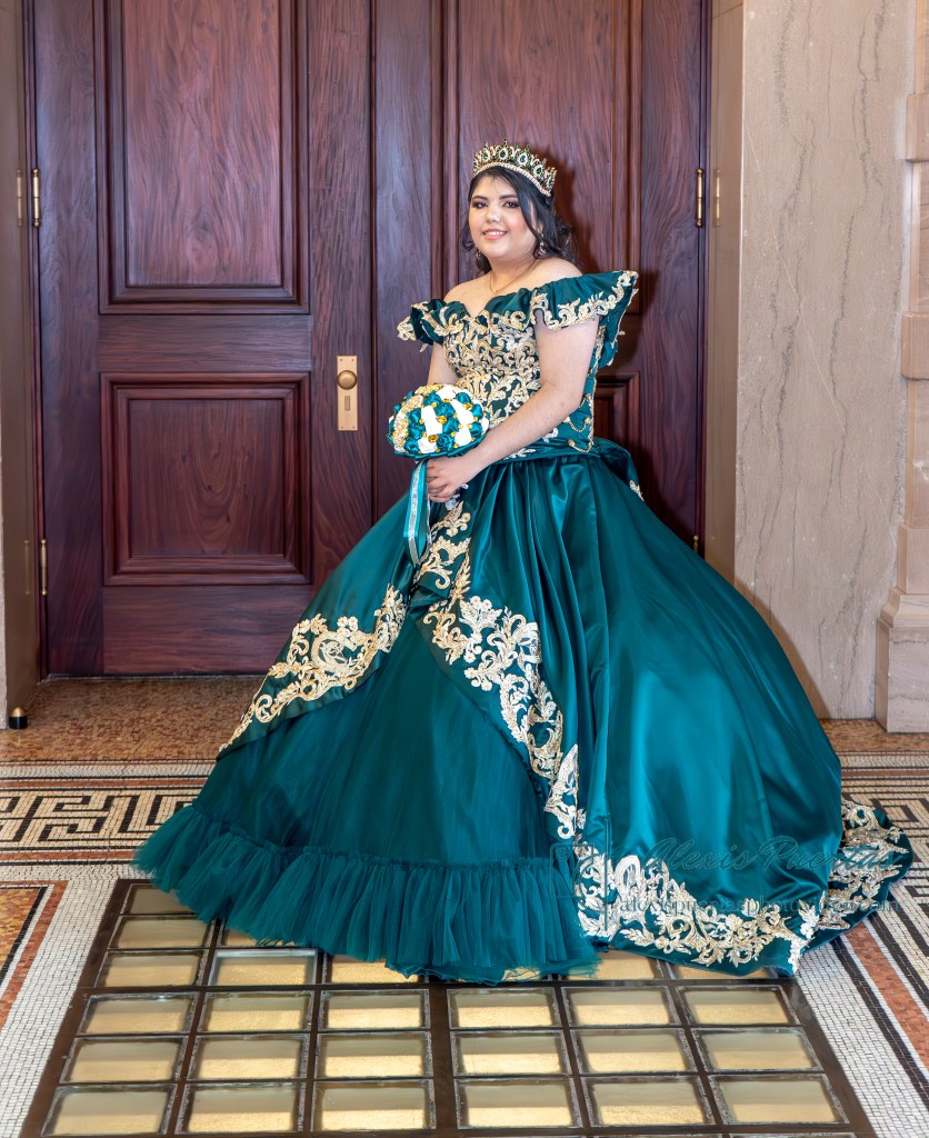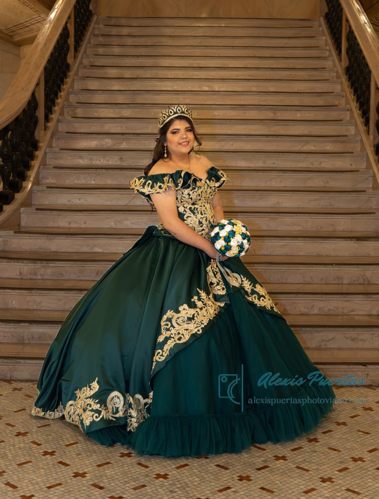 Preciosa quinceañera con su bellísimo vestido verde con detalles dorados
