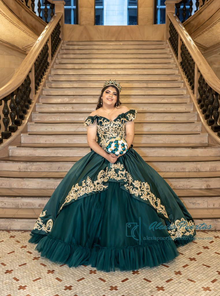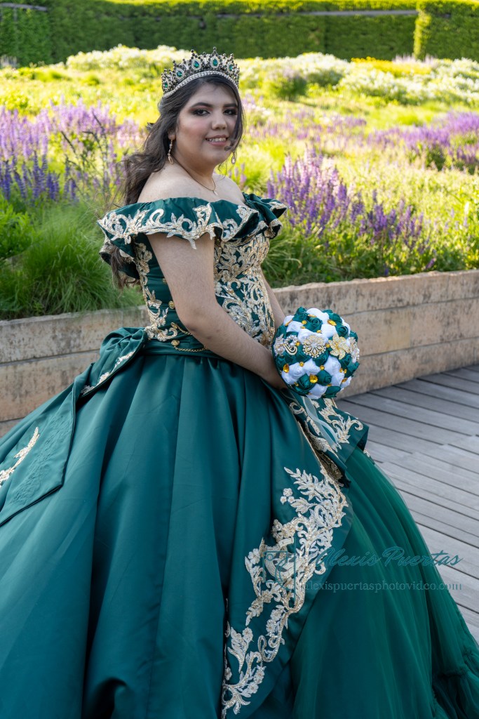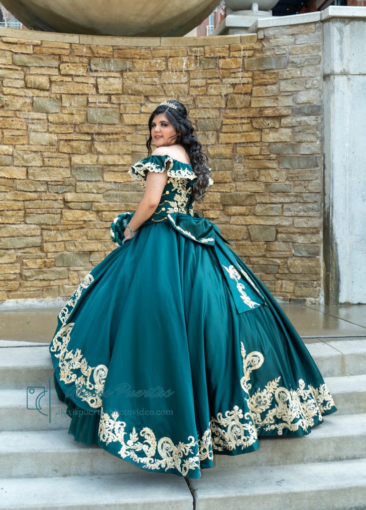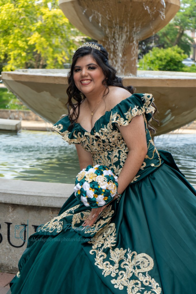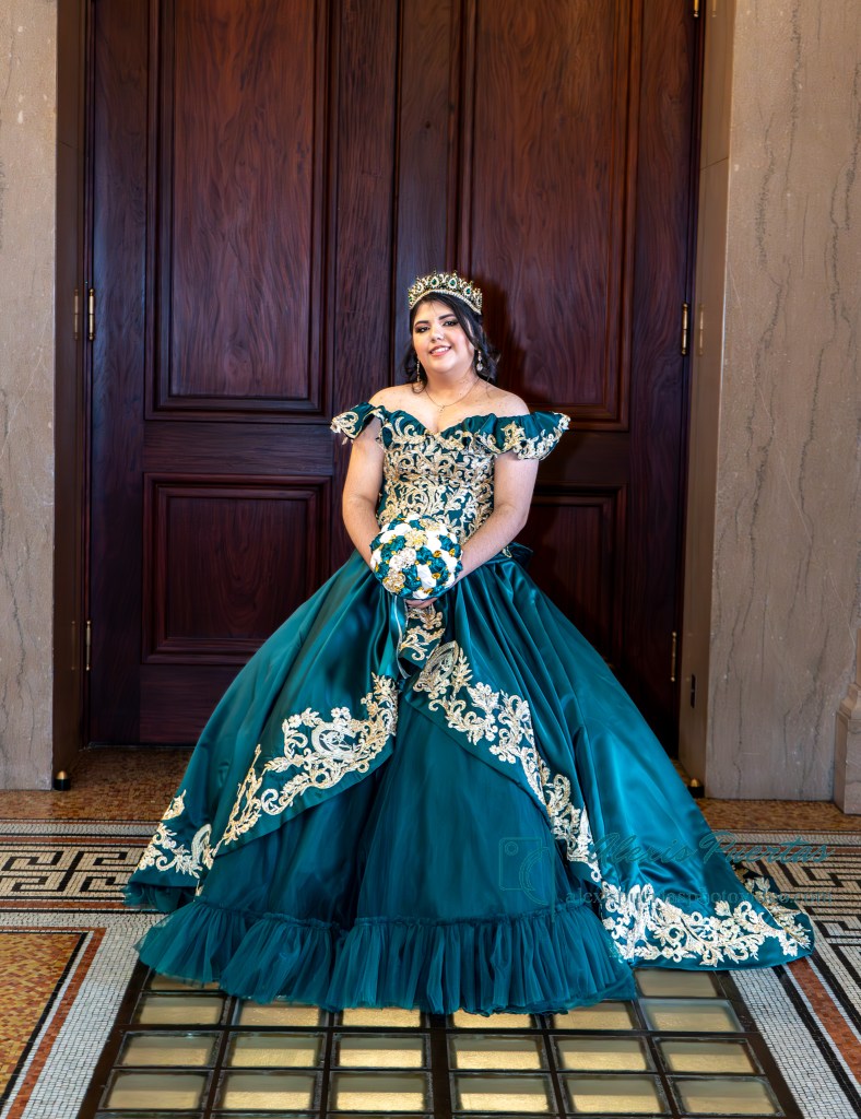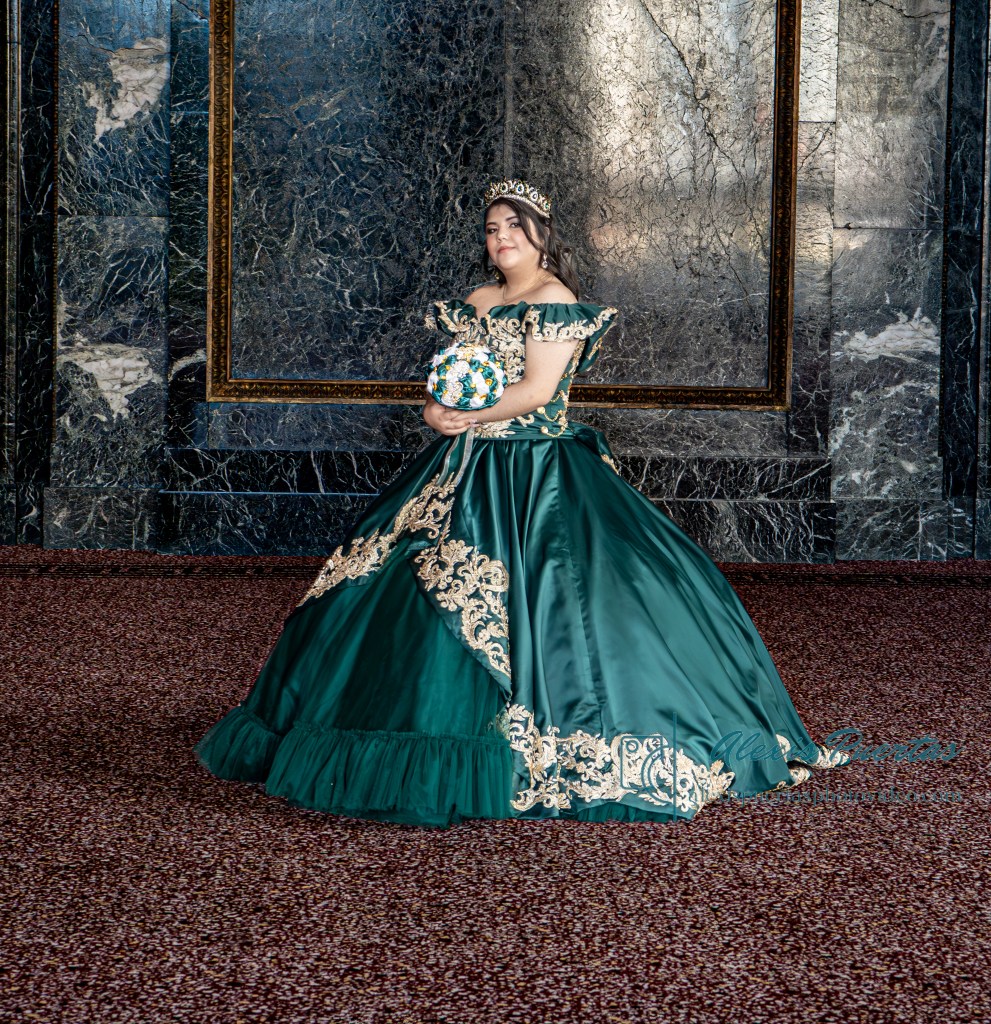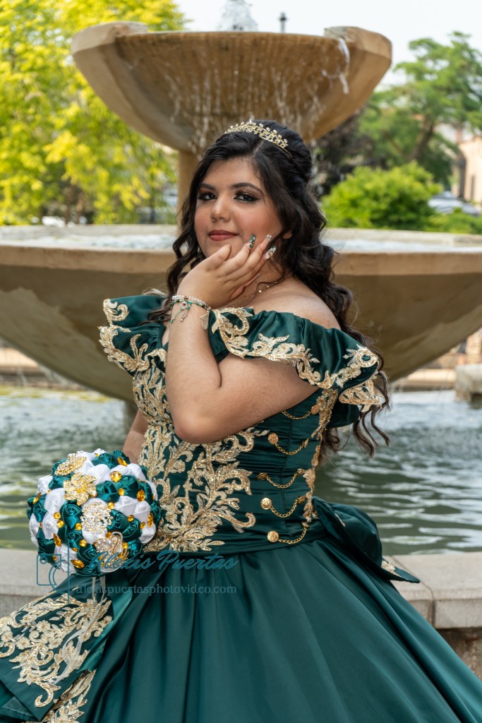 Preciosa quinceañera con su bellísimo vestido verde con detalles dorados