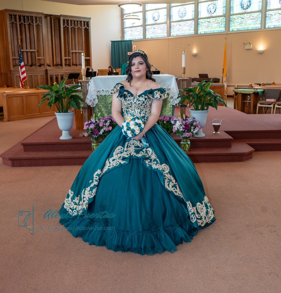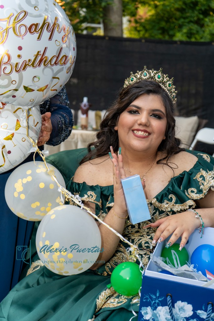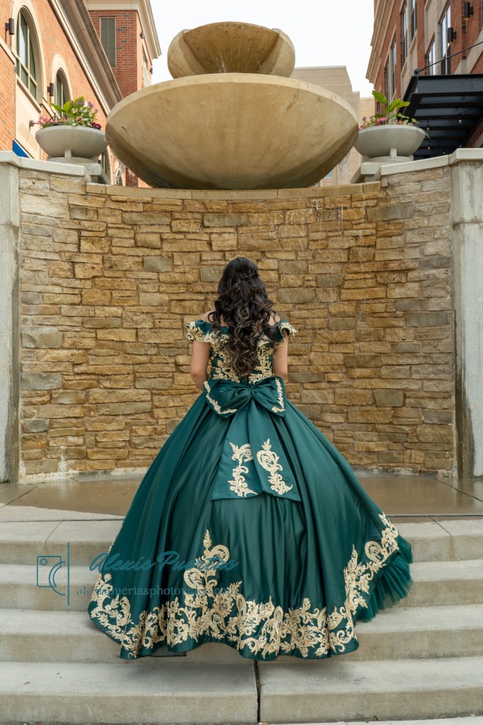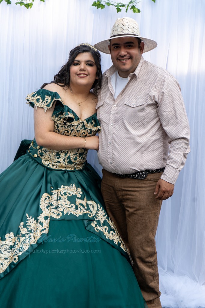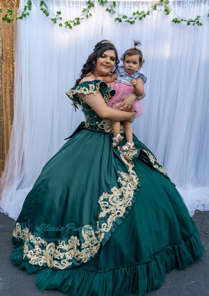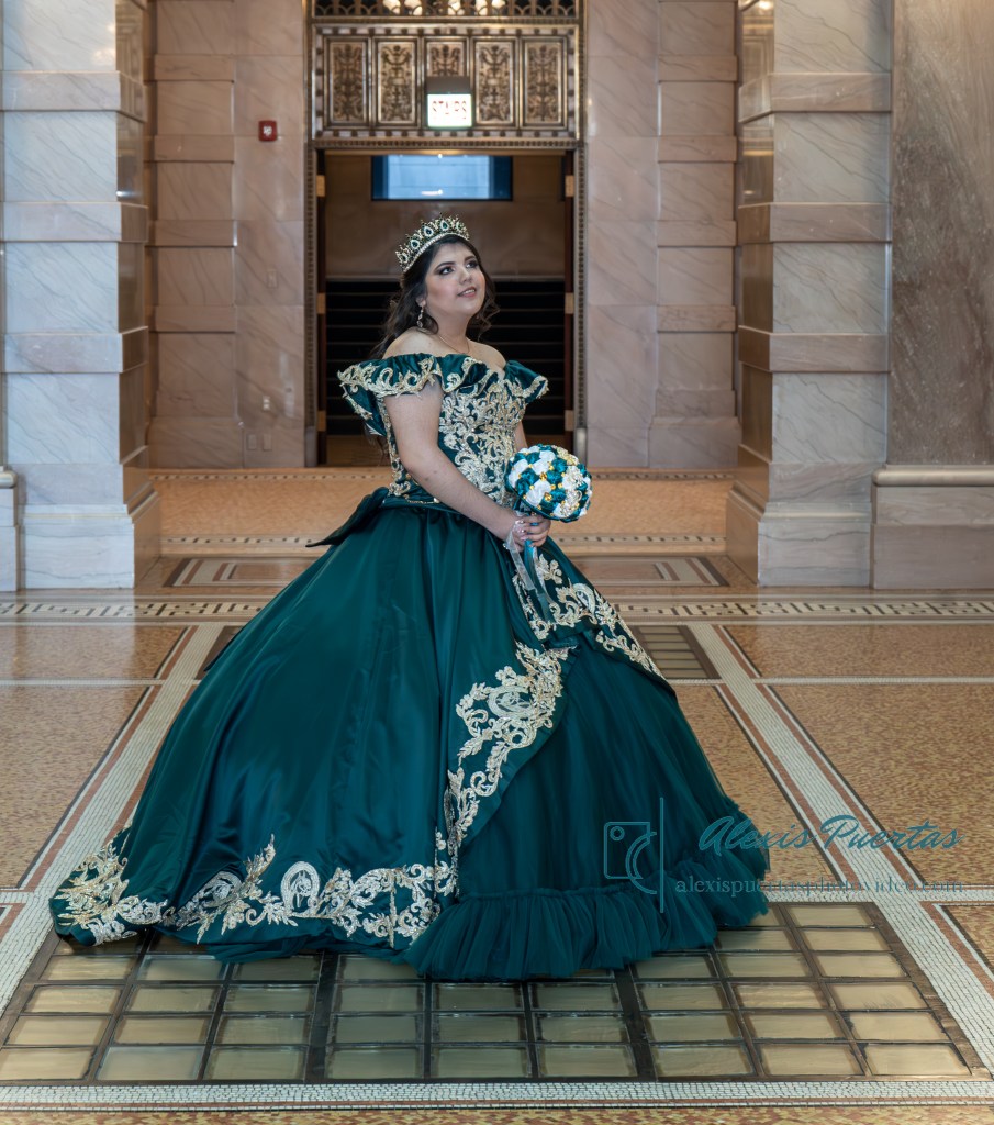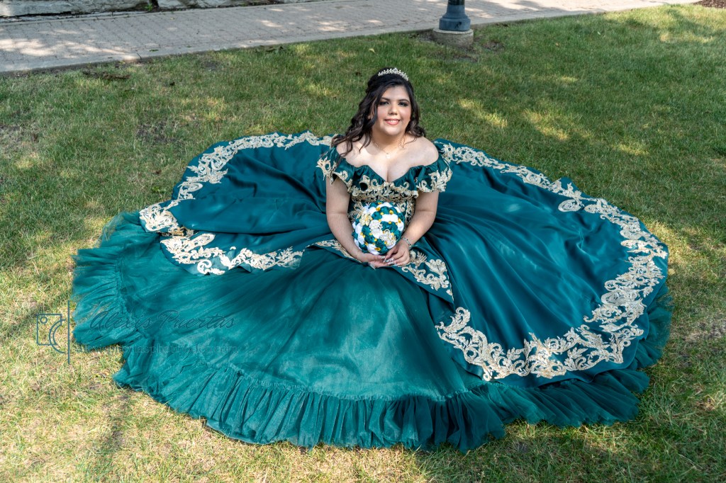 Preciosa quinceañera con su bellísimo vestido verde con detalles dorados