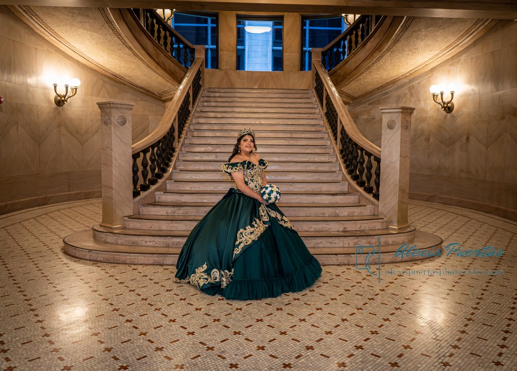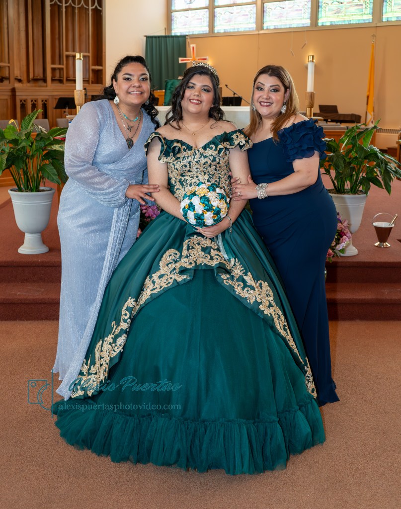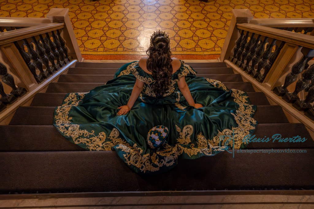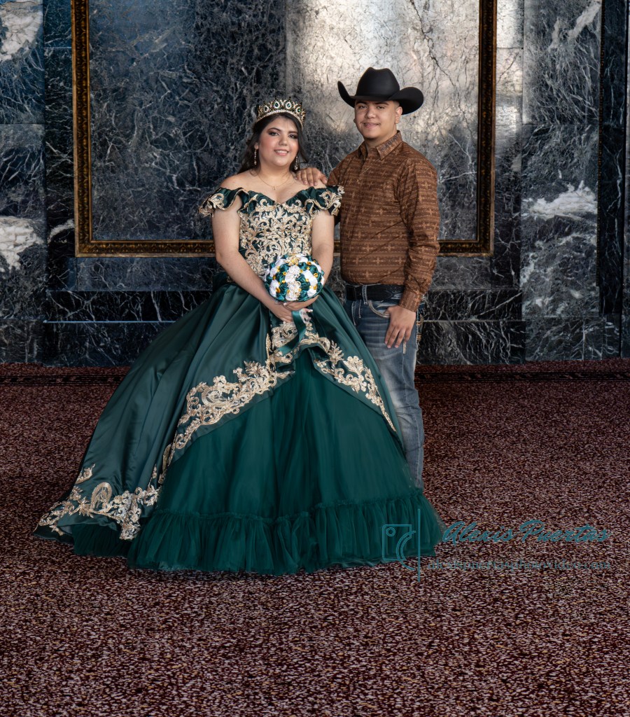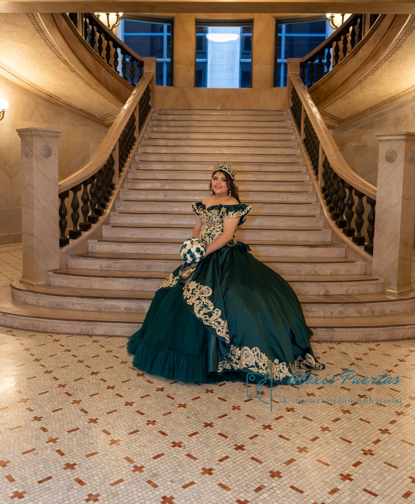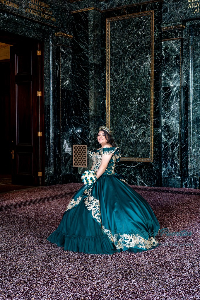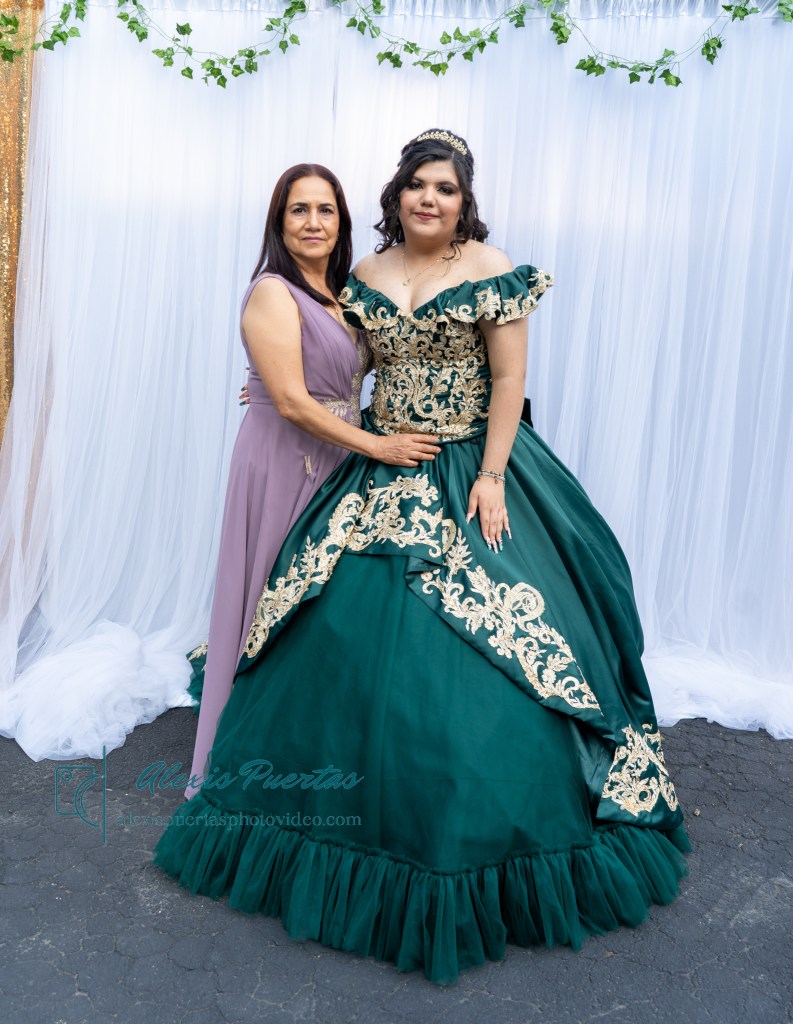 Preciosa quinceañera con su bellísimo vestido verde con detalles dorados