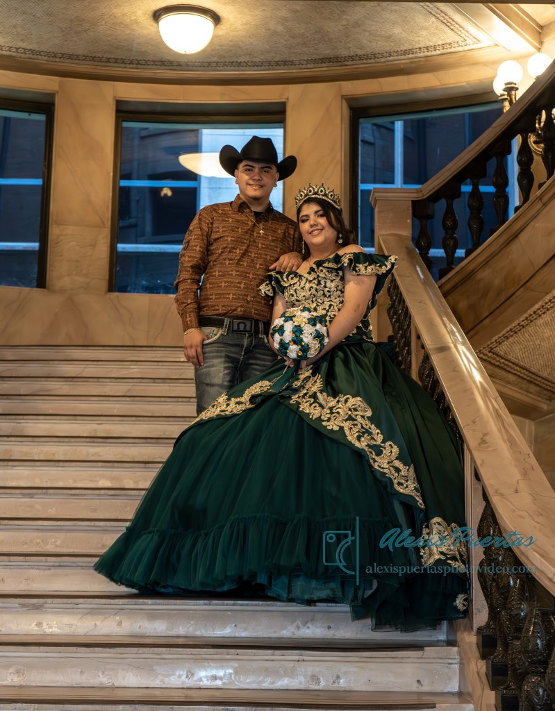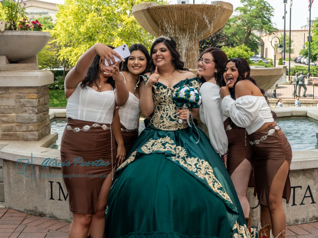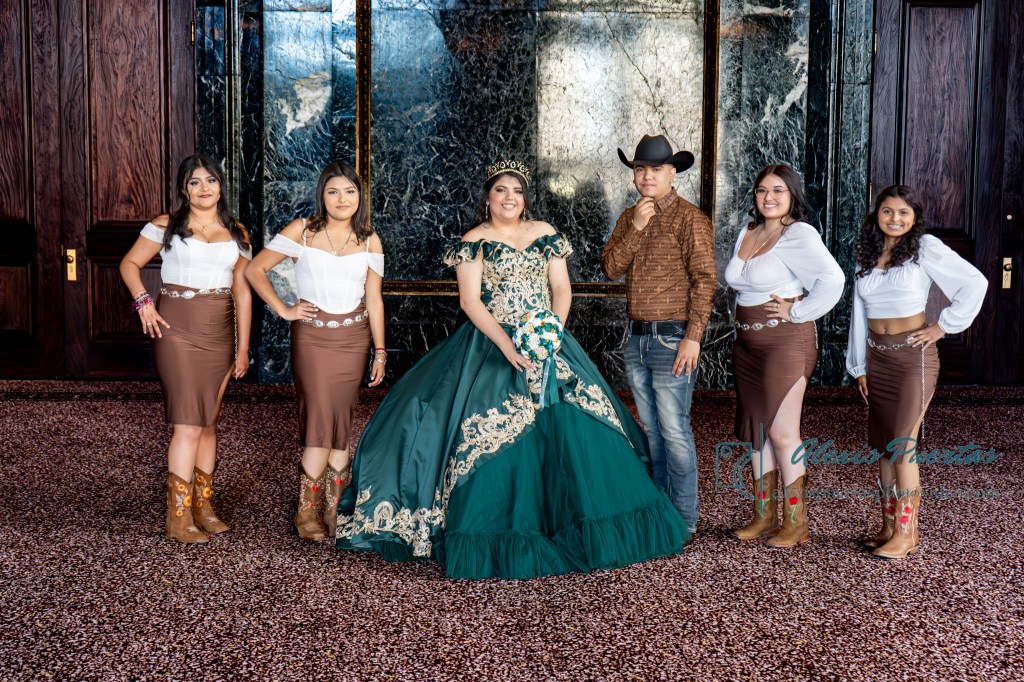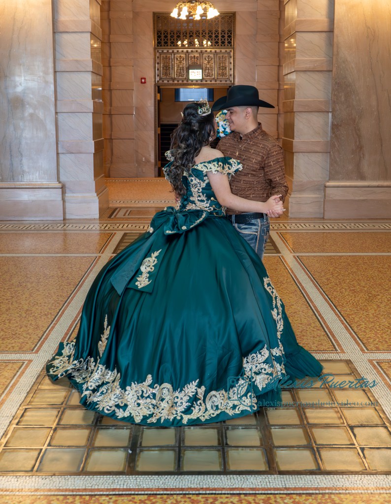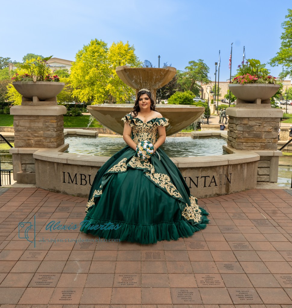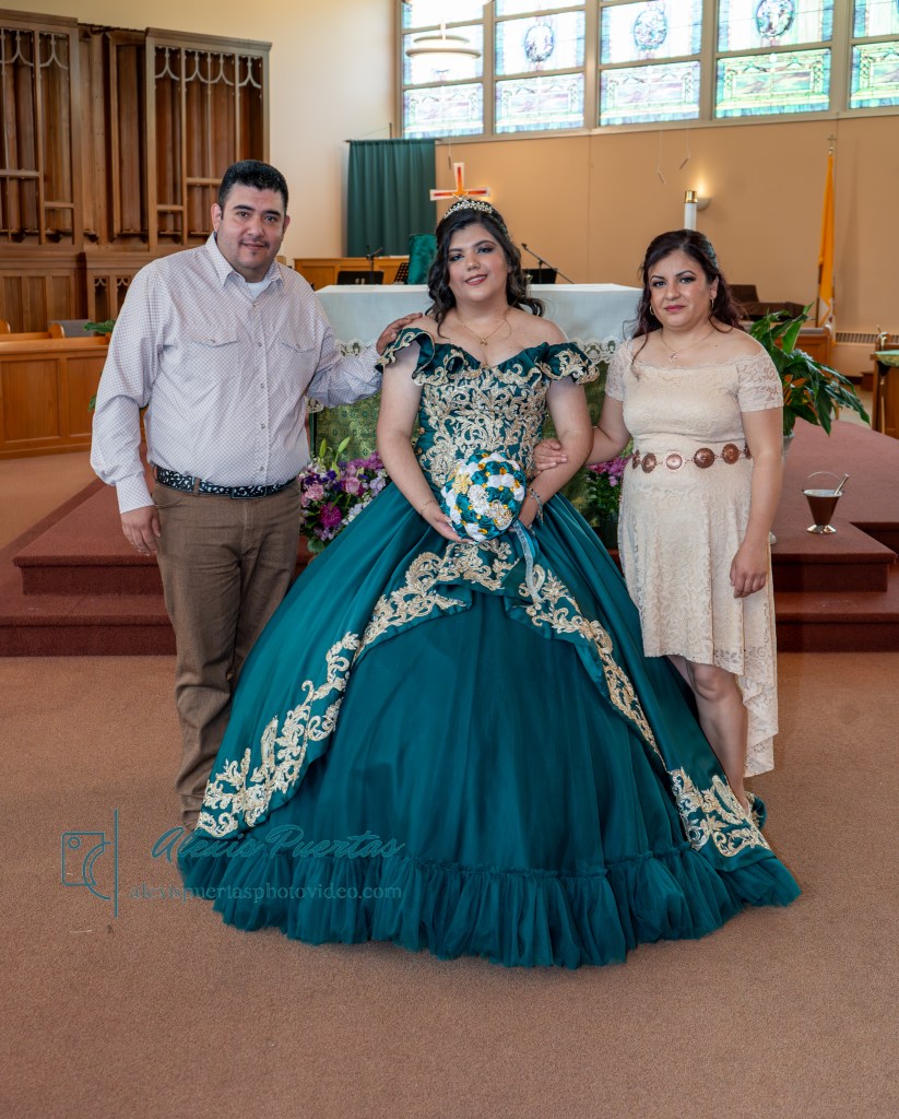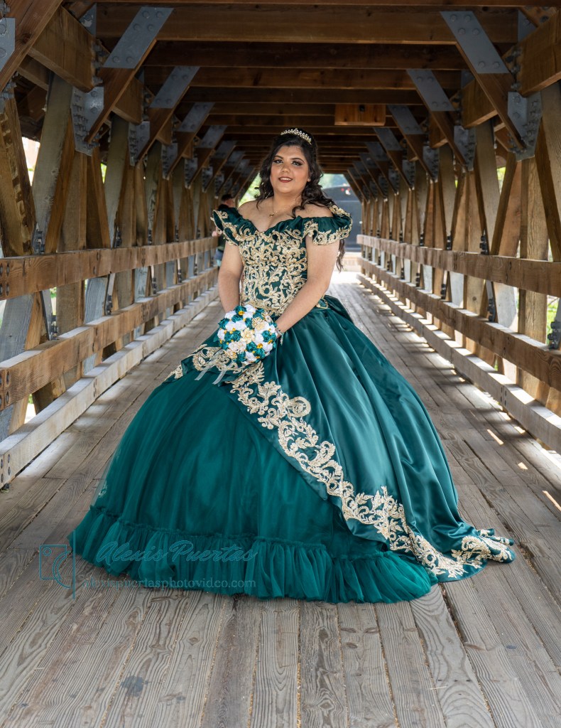 Preciosa quinceañera con su bellísimo vestido verde con detalles dorados