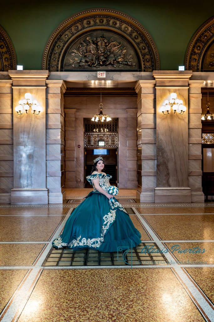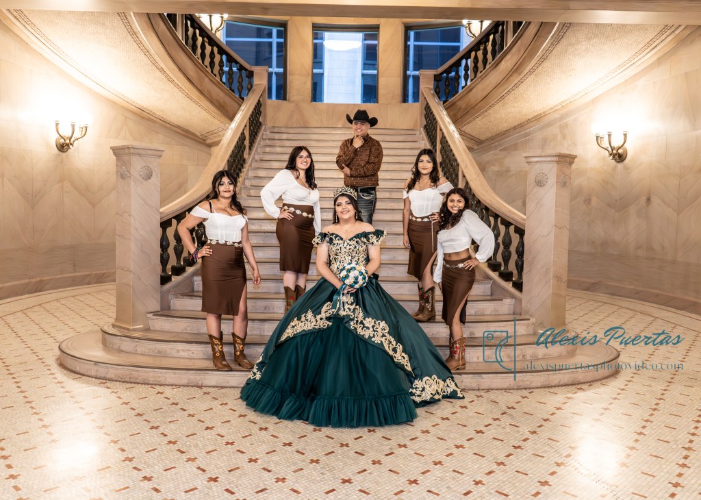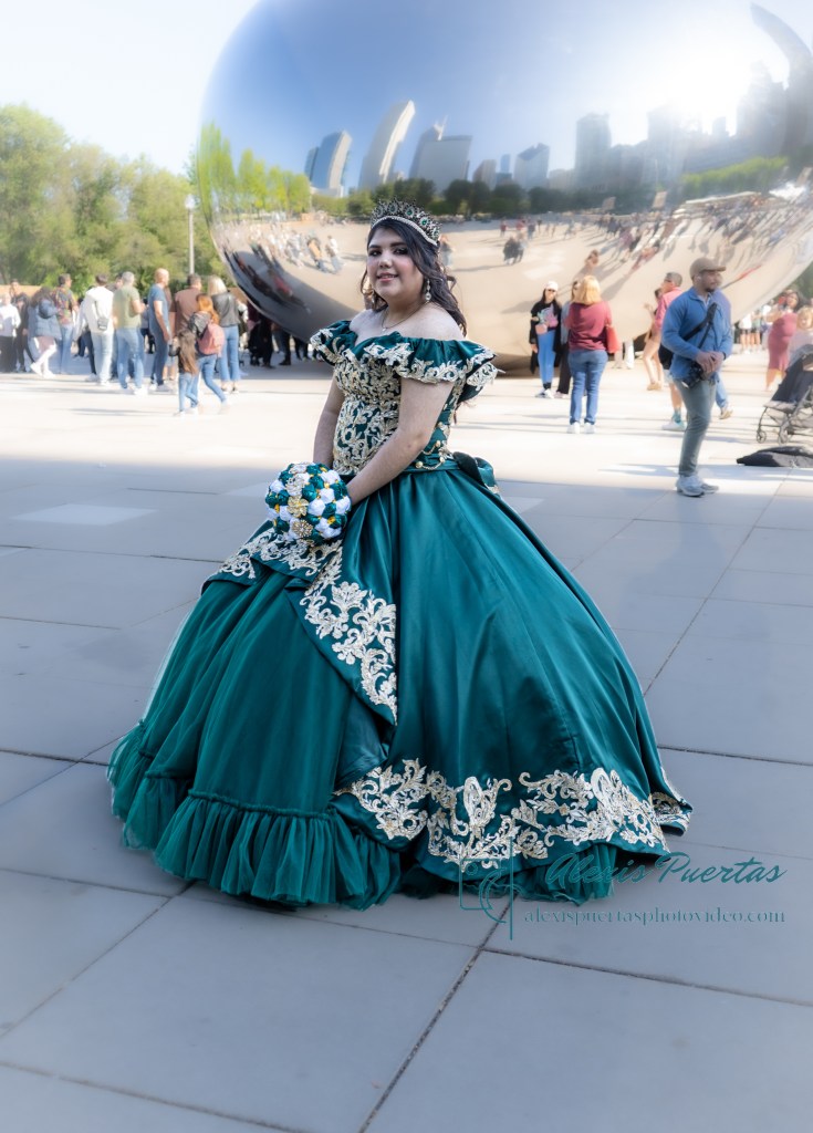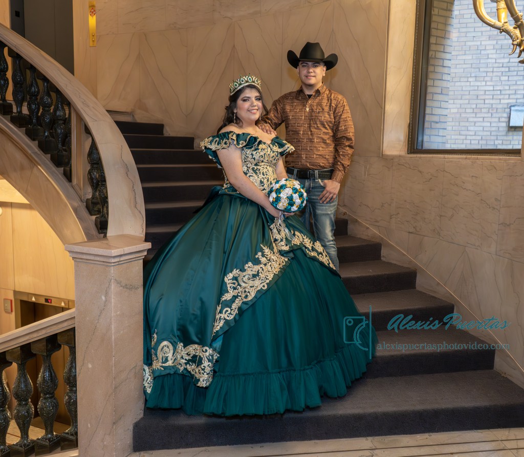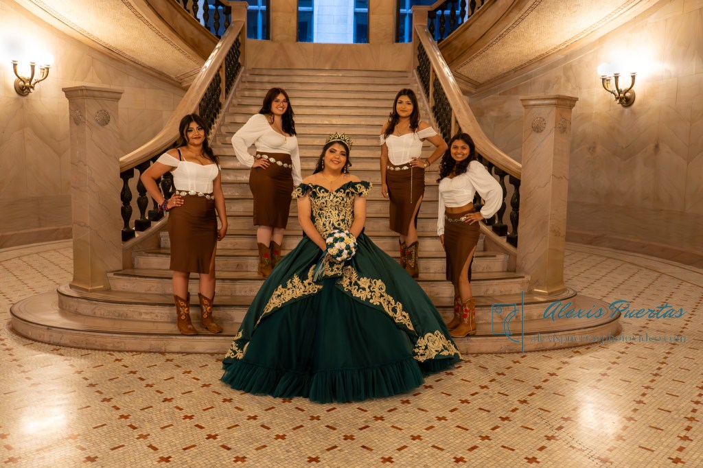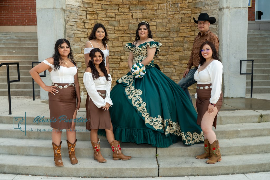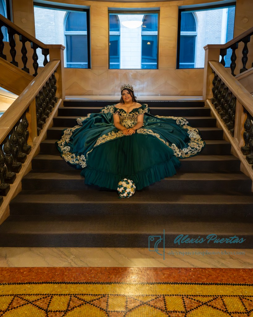 Preciosa quinceañera con su bellísimo vestido verde con detalles dorados