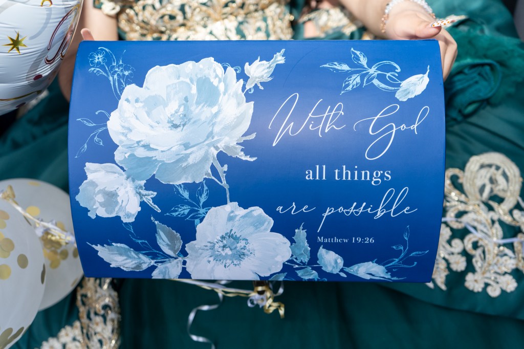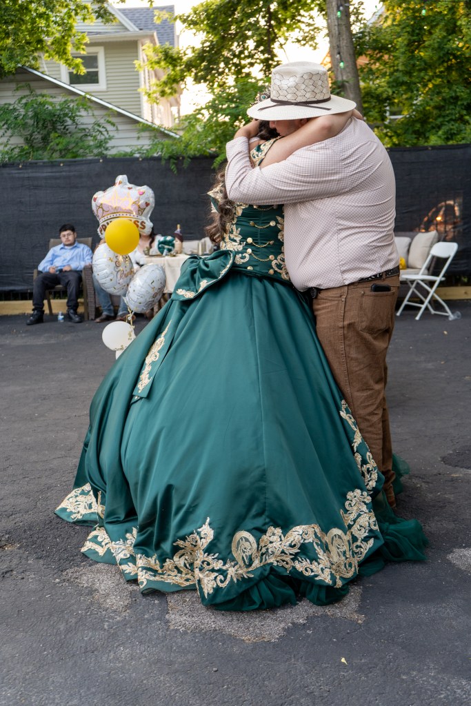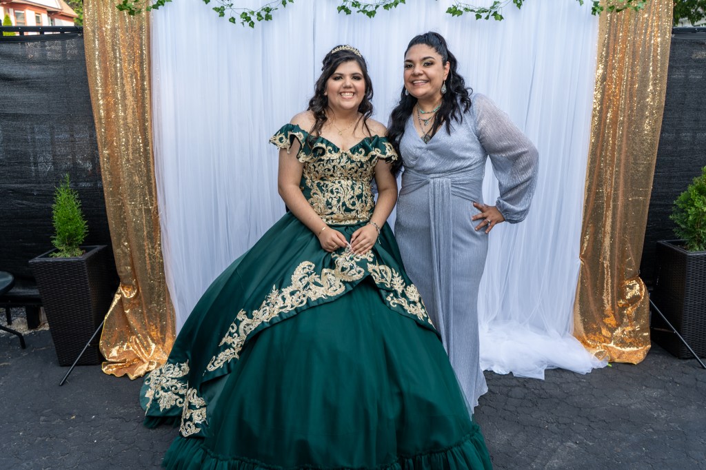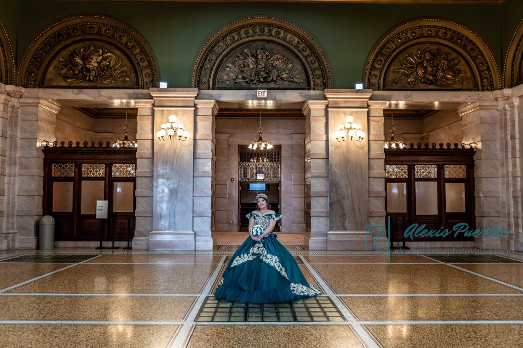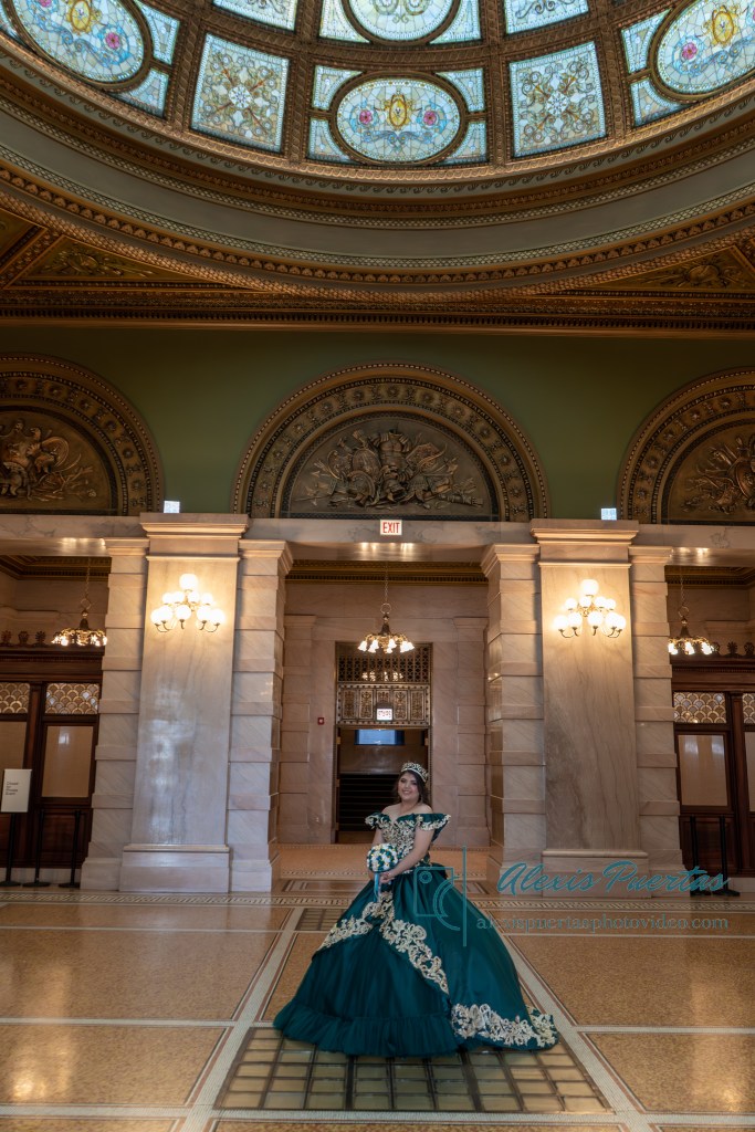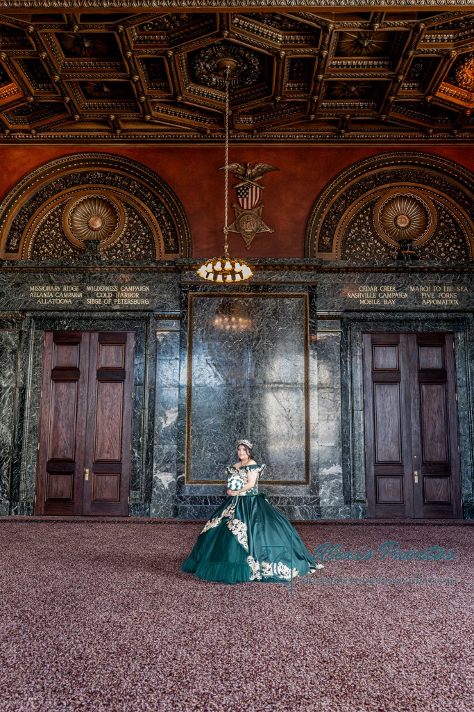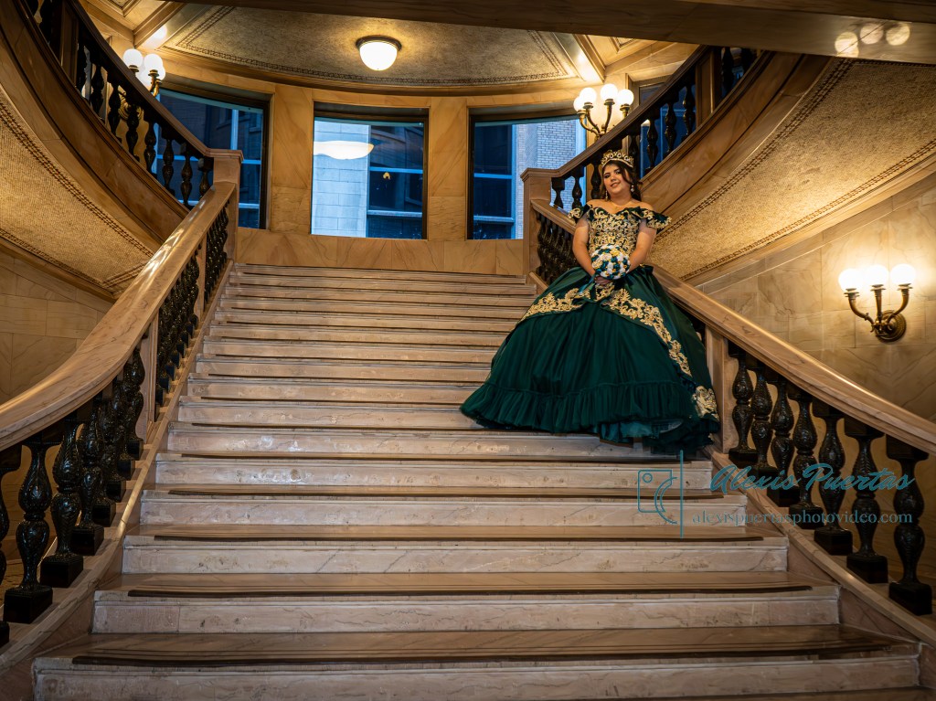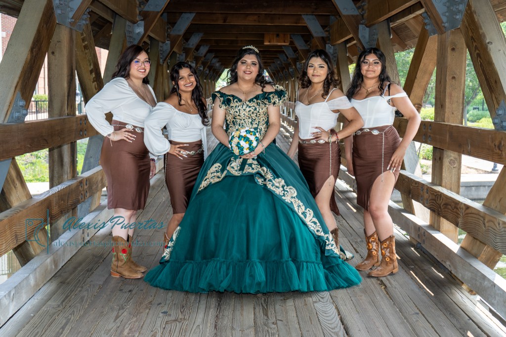 Preciosa quinceañera con su bellísimo vestido verde con detalles dorados